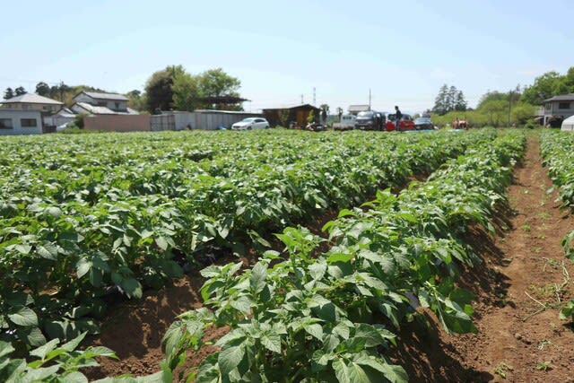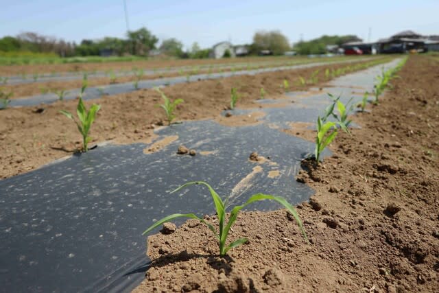 マルチを張られたジャガイモは例年に比べ生長が早い。