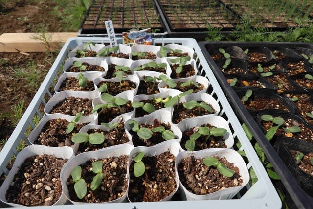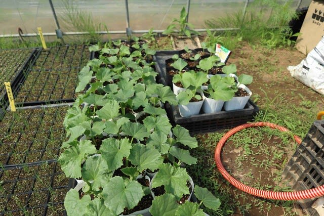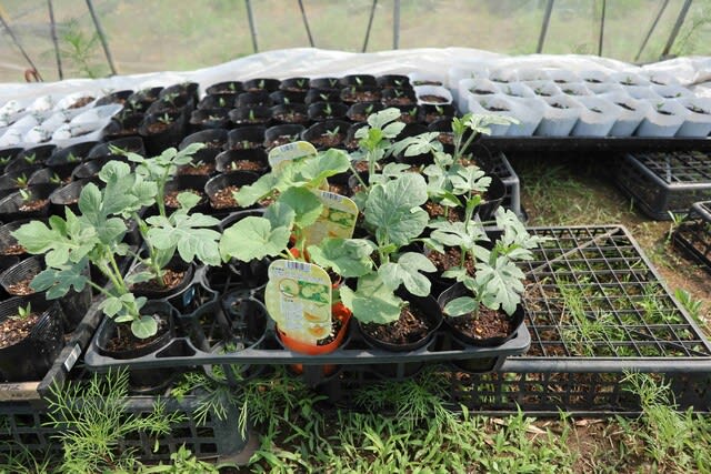 キュウリ、カボチャ、ナス、メロン、スイカ、エダマメ等の苗も若者たちが作っています。