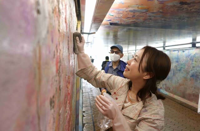 突如現れて噴霧器と雑巾を持って凸凹の壁を拭いていく植田さん。