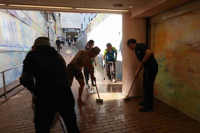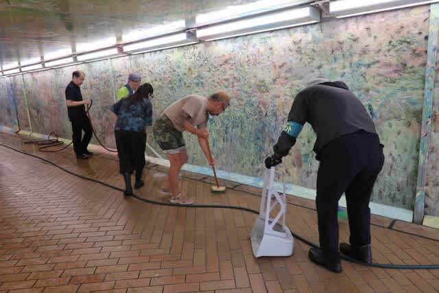ホース180m(50mリール3個に30m)、大工道具やガム取りヘラまでそれぞれ持ち寄り、すべてないと出来ません。
