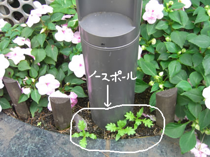 五差路の地下鉄排気筒のツタ緑化計画地に実生のノースポールが芽を出し始めました。