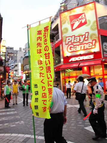 「客引きの甘い誘いに注意 案内先はぼったくりの店です」と書いたのぼりを持ってのパトロール。