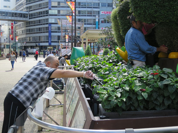 西口公園前のプランターがどうしても荒れてしまいます。今日は剪定作業。